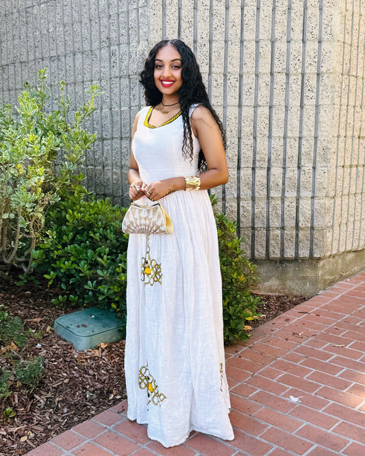 White Habesha Kemis Gold Embroidered Detail Habesha Dress Sleeveless Ethiopian Clothing 560