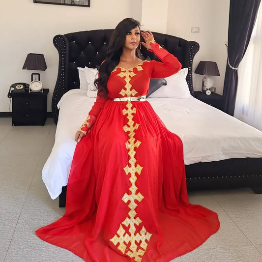 Stunning Habesha Dress for Women Elegant Ethiopian Clothing Red And Gold Embroidery Habesha Wedding Dress 117