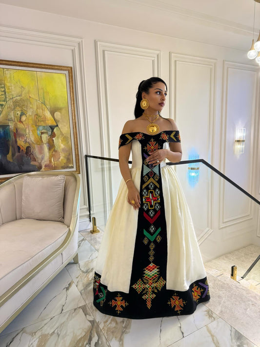 Off-Shoulder Habesha Dress with Black Panel and Multicolor Embroidery Elegant Ethiopian Dress Festive Habesha Kemis 707