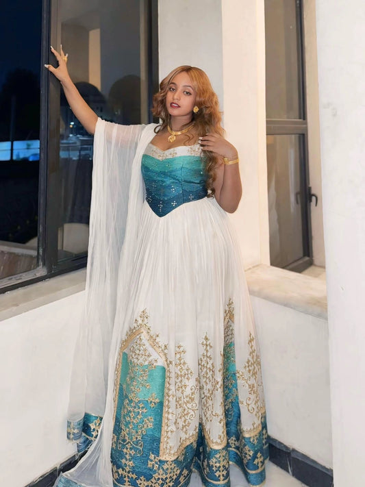 Turquoise & Gold Habesha Dress Elegant Traditional Ethiopian Wedding Dress Classic Habesha Kemis 166
