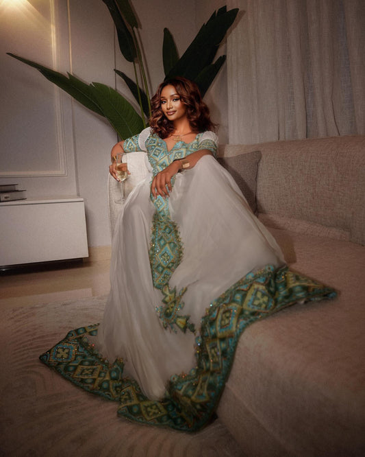 Off Shoulder Teal Embroidery Habesha Kemis Traditional Ethiopian Dress Graceful Habesha Dress 715