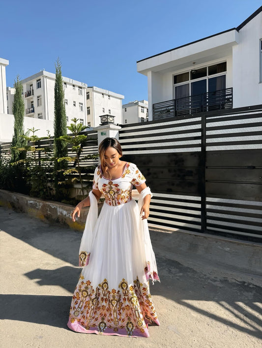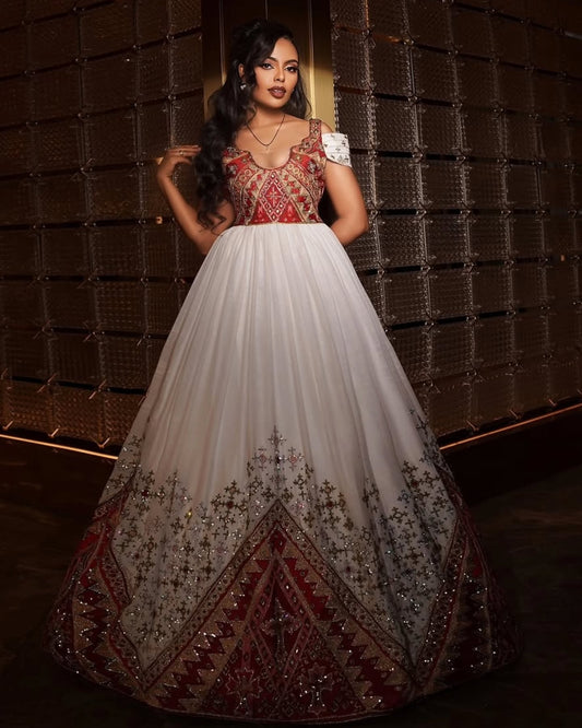 Glamorous Traditional Ethiopian Dress with Gold, Rich Red and Soft Pink Embroidery for Stunning Weddings