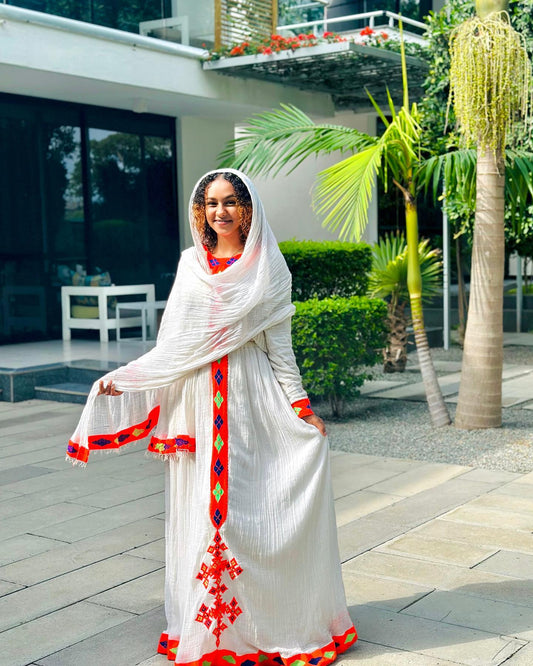White Habesha Kemis with Red Hem Stylish Habesha Dress Traditional Ethiopian Dress 500