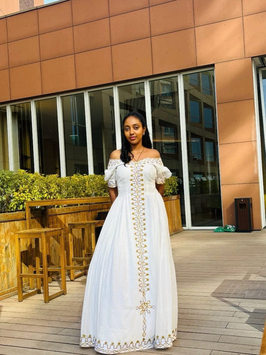 White Off-Shoulder Habesha Kemis Golden Details Habesha Cloth Stylish Habesha Dress 522