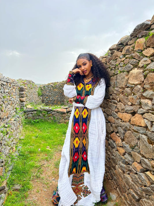 Exquisite Ethiopian Wedding Dress with Colorful Embroidery – Habesha Kemis – Cultural Dress – Eritrean Wedding Dress