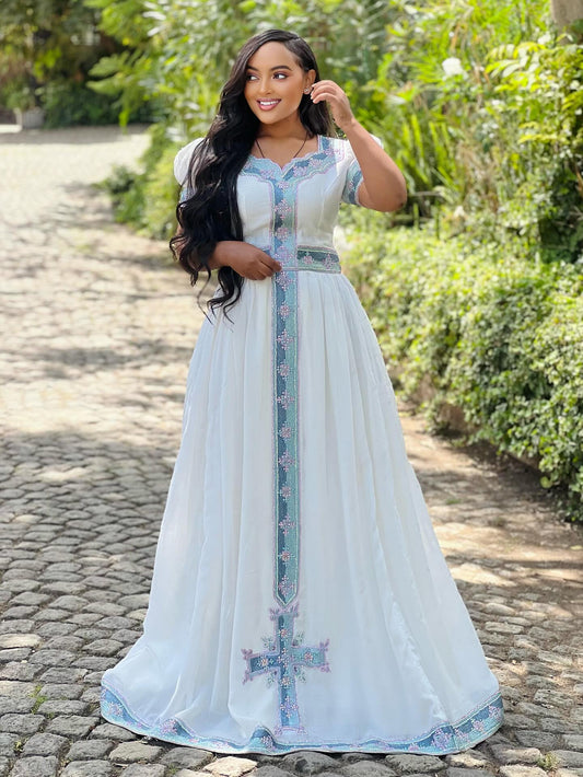 Puff Sleeve Habesha Dress with Embroidery Ethiopian Traditional Dress Stylish Habesha Kemis 708