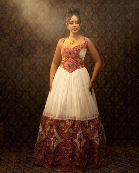 Glamorous Traditional Ethiopian Dress with Gold, Rich Red and Soft Pink Embroidery for Stunning Weddings