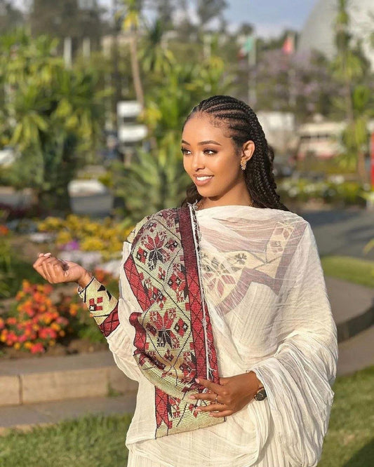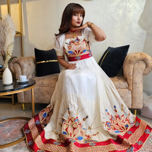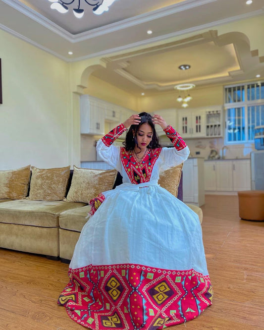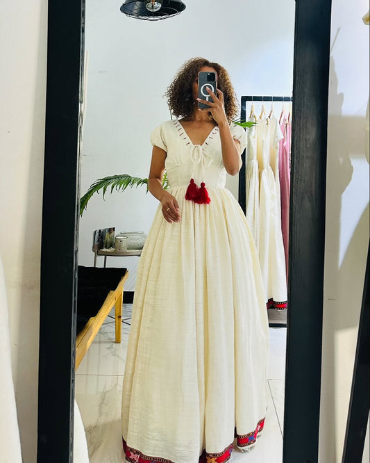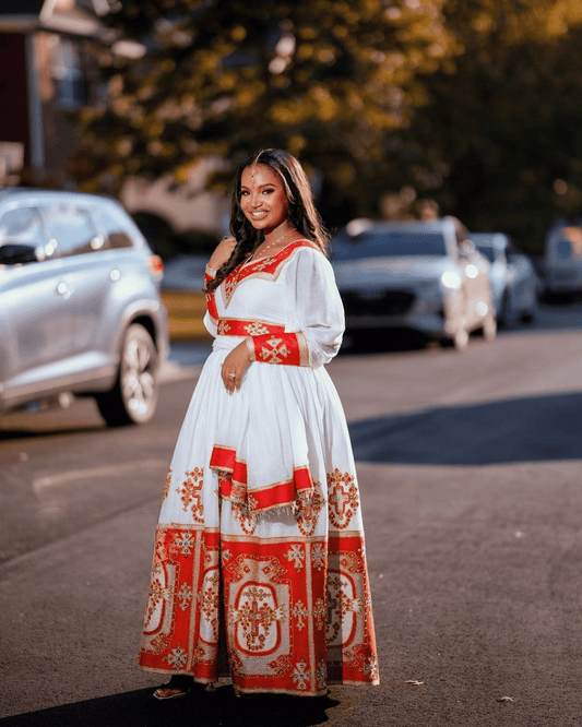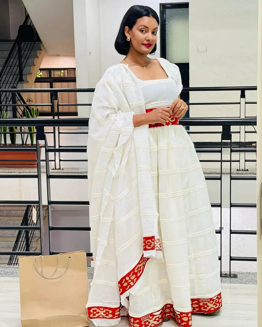 Charming Habesha Dress with Red Accents – Modern Ethiopian Dress