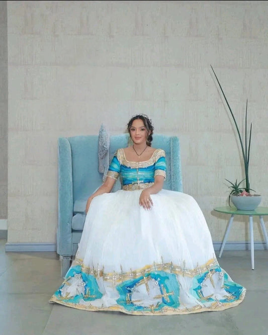 Charming Creamy with Blue Ethiopian Traditional Dress: with Rhinestone/Silver Handmade Ornaments Habesha Dress Simple Eritrean Clothing