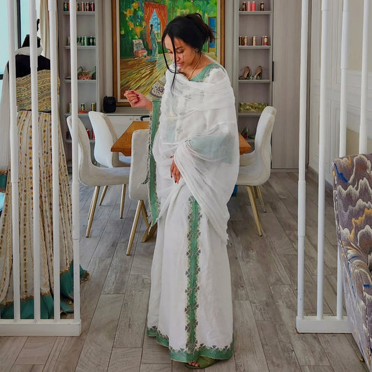 Charming Green Traditional Ethiopian Dress: with Shimmering Detailing Habesha Kemis Modern Features on Eritrean Dress