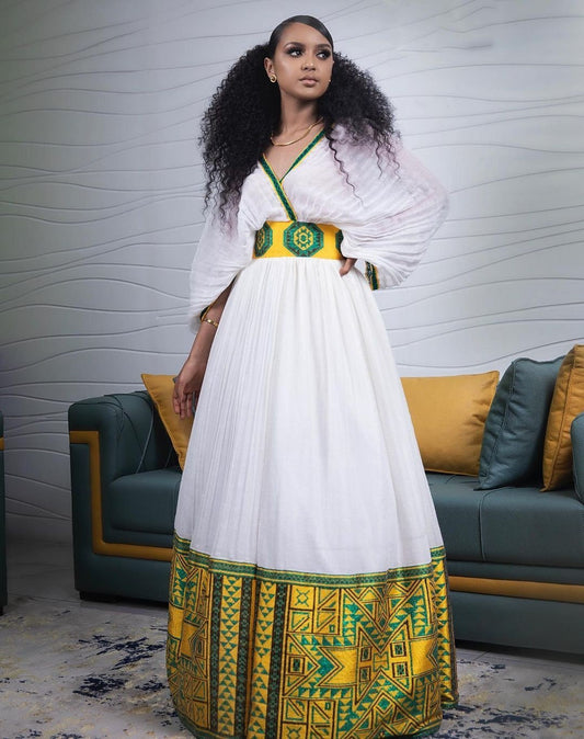 Elegant Habesha Dress with Green and Gold Embroidery – Habesha Kemis – Ethiopian Traditional Clothing
