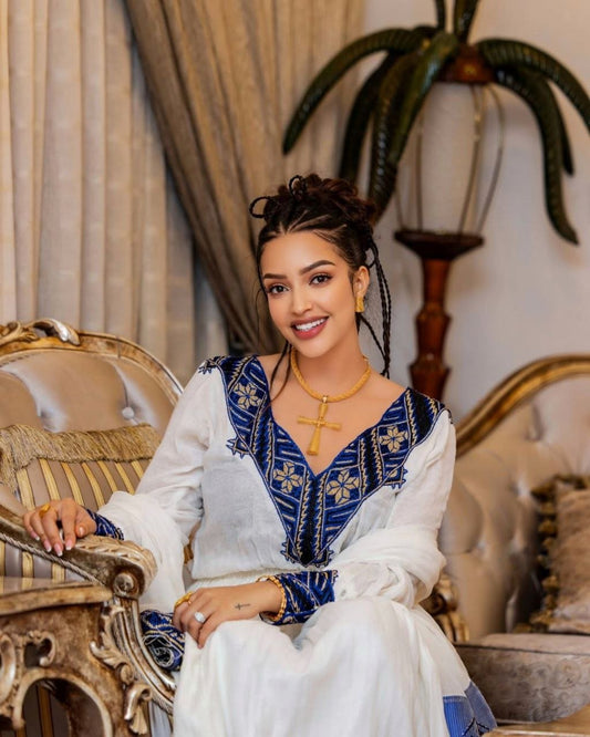 Elegant Habesha Dress with Bold Blue Embroidery for Church Ceremonies and Cultural Events