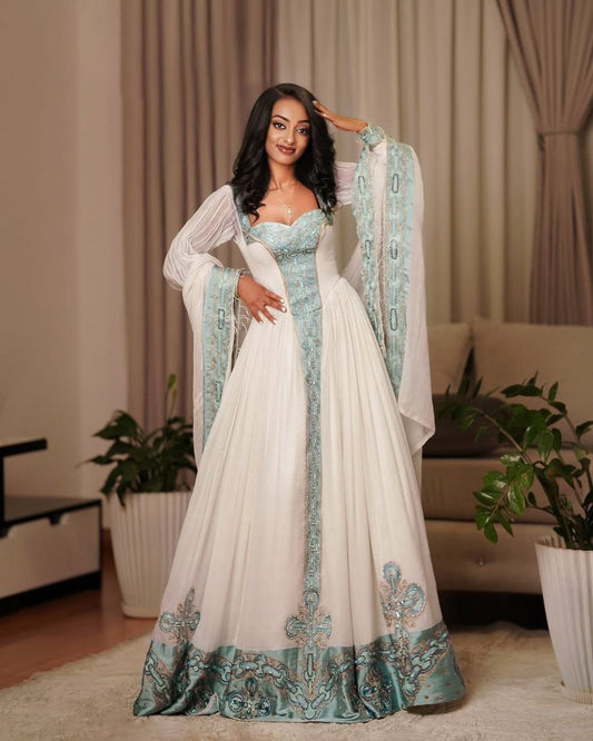 Elegant Habesha Dress with Aqua Blue Embroidery for Special Occasions