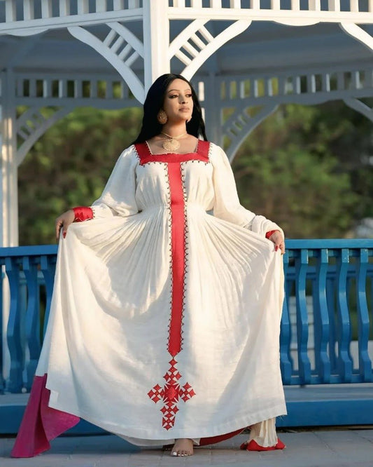 Elegant Habesha Kemis with Red Accents – Habesha Dress – Eritrean Clothing – Habesha Clothing