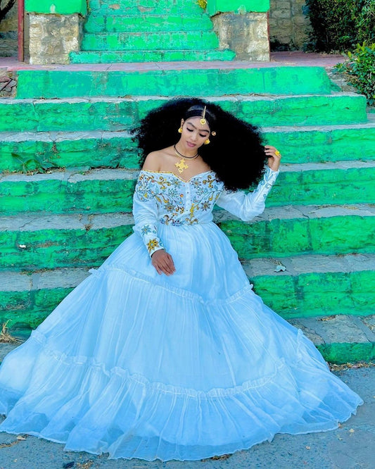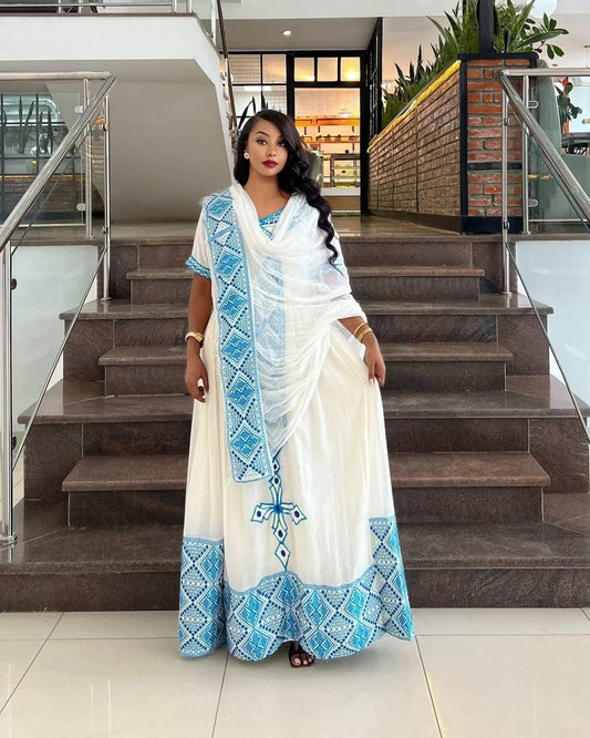 Elegant Habesha Dress with Striking Light Blue Embroidery for Cultural Events