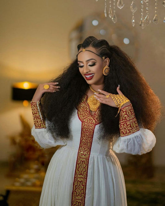 Elegant Habesha Dress with Vibrant Red and Gold Embroidery for Weddings