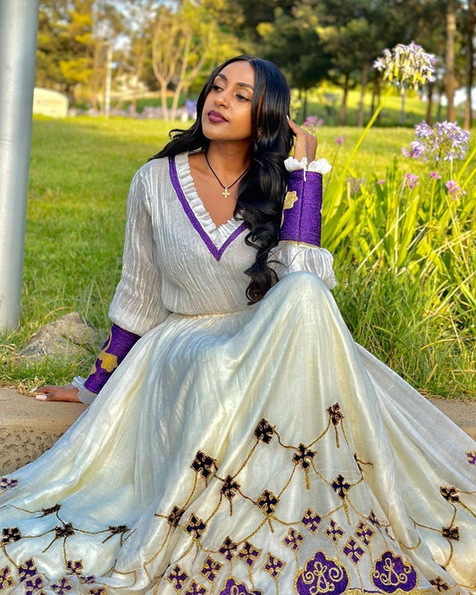 Modern Habesha Dress with Shawl Floral Ethiopian & Eritrean Clothing Yellow And Purple Pattern Habesha Kemis 135