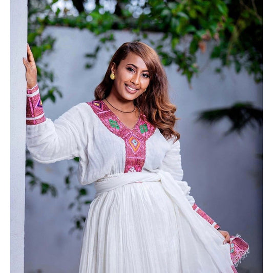 Modern Habesha Dress White Traditional Skirt & Pink Tibeb Vest Habesha Kemis Perfect Blend Of Habesha Cloth 0045