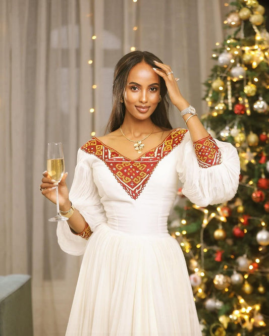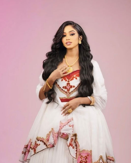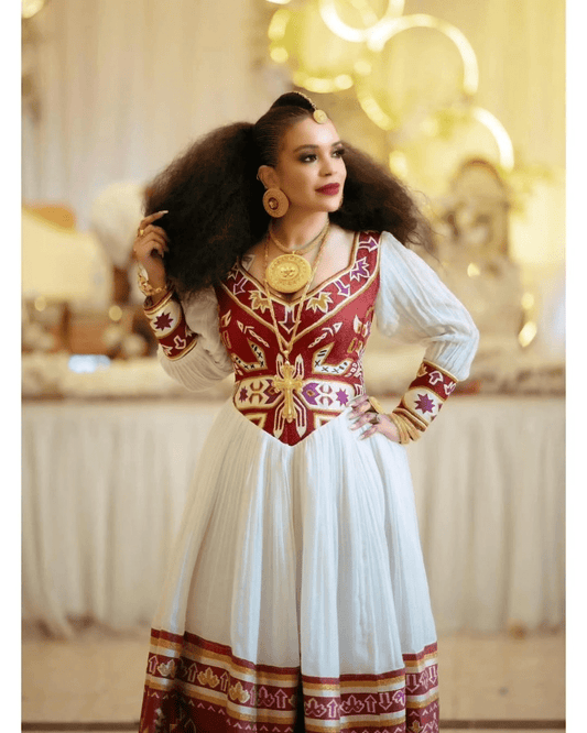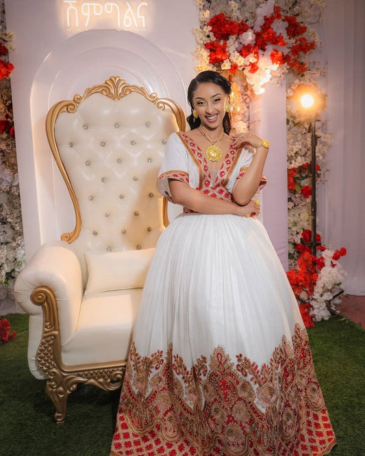 Modern Habesha Wedding Dress with Red and Gold Embroidery – Ethiopian Wedding Dress – Habesha Clothing