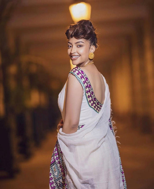 Radiant Purple Majesty: Modern Menen Fabric in Habesha Kemis