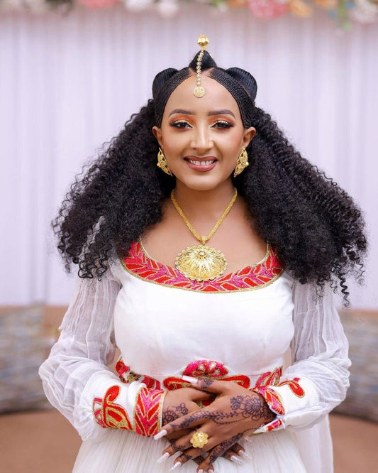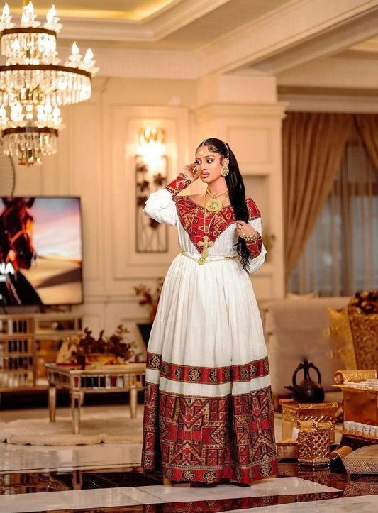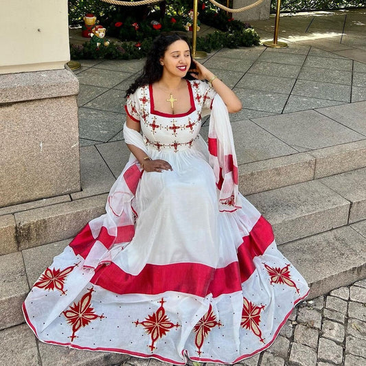 Radiant Red Habesha Dress: Handstitched Cross Embroidery on Traditional Ethiopian Dress for Your Next Celebration Eritrean Clothing