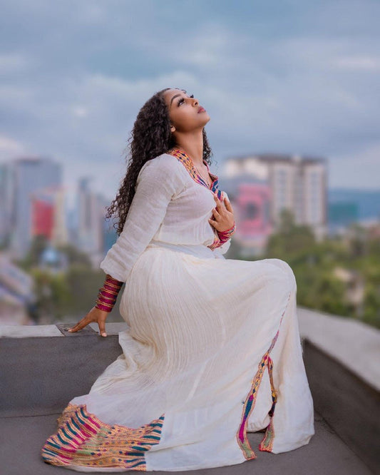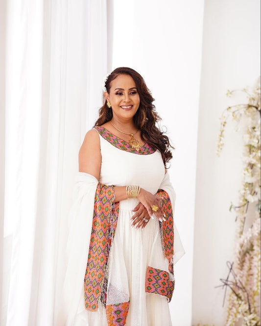 Radiant Multicolored Ethiopian Traditional Dress: with Colorful Hemline Eritrean Clothing Eye Catching Habesha Kemis