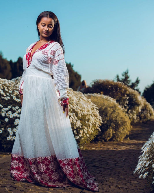 Ravishing Red Tilf Habesha Kemis with Shimena Dress and Menen Fabric, Habesha Kemis, Eritrean dress, ሀበሻ