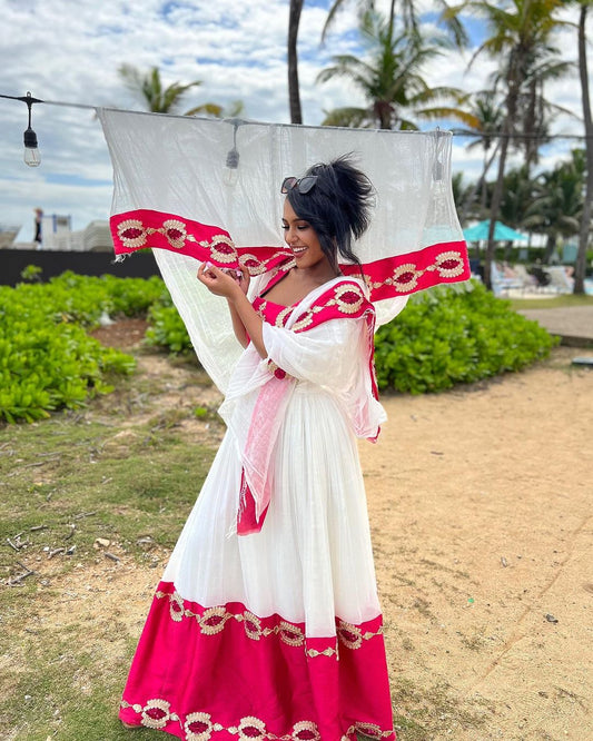 Radiant Roses Habesha dress Embrace Ethiopian Elegance with Vibrant Red and Pink Habesha Kemis