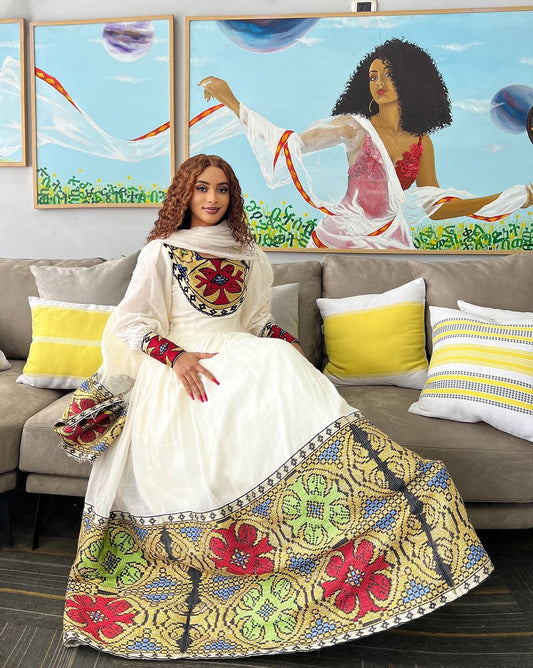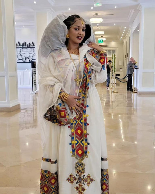 Radiant Multicolored Traditional Ethiopian Dress: with Eye Catching Colorful Embellishments Habesha Dress for Any Occasions Habesha Kemis