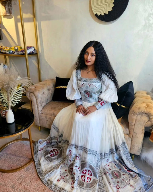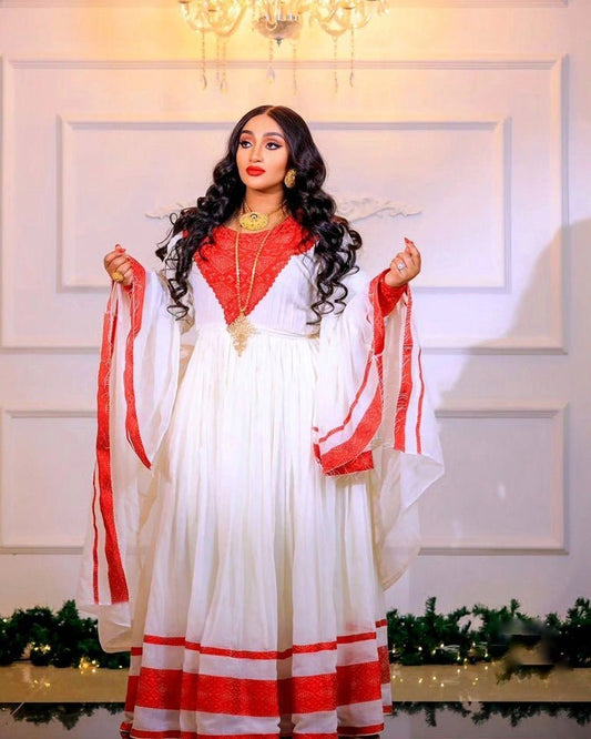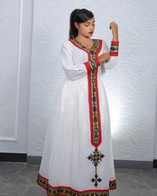 Red Embroidered Habesha Kemis Long Sleeve Ethiopian Traditional Dress Cross Design Habesha Dress 165