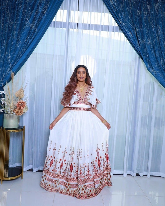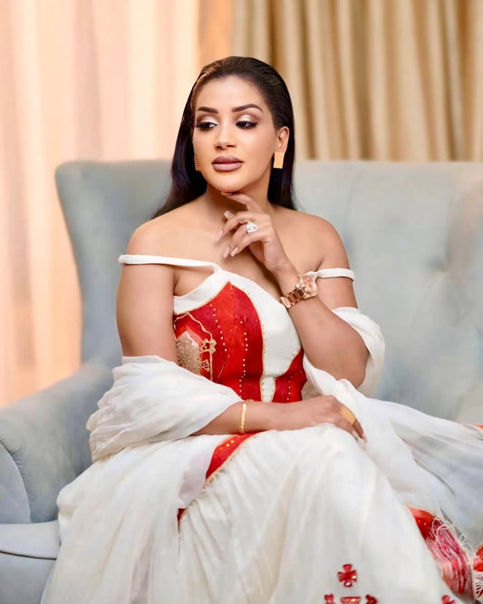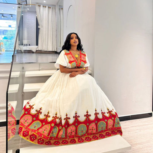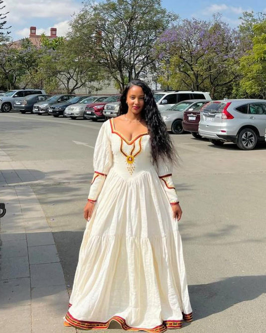 Red & Gold Embroidered Habesha Kemis Traditional Ethiopian Dress for Women Cream Base Accented Habesha Dress 0067