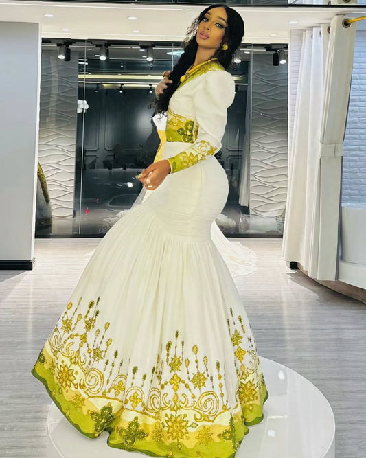 Regal Golden & Green Mermaid-styled Ethiopian Dress with Intricate Detailing