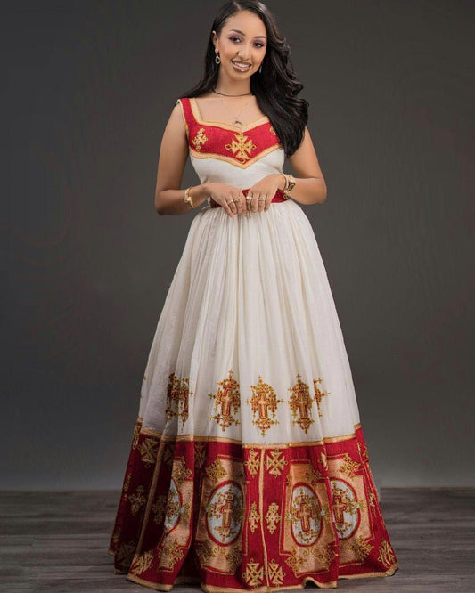 Regal Look with Colorful Habesha Dress: Amazing Cross Shaped Embroidery Traditional Ethiopian Dress Pleasant Ethiopian Wedding Dress