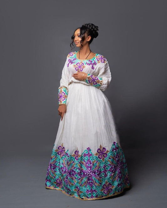 Regal Menen Habesha Kemis with a Stunning Purple and Blue Tilf Pattern and Shimena Dress, Habesha Kemis, Eritrean dress, ሀበሻ