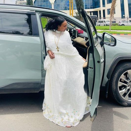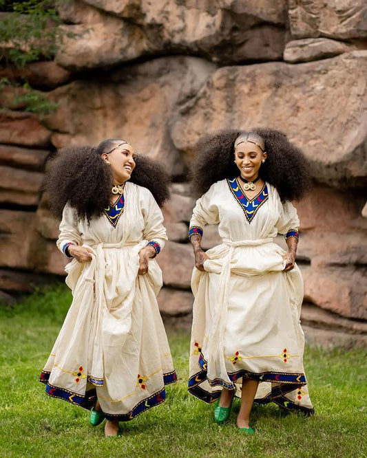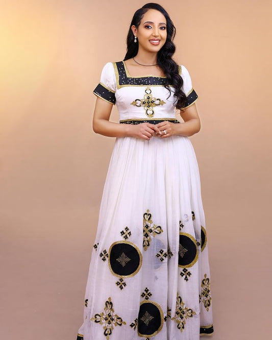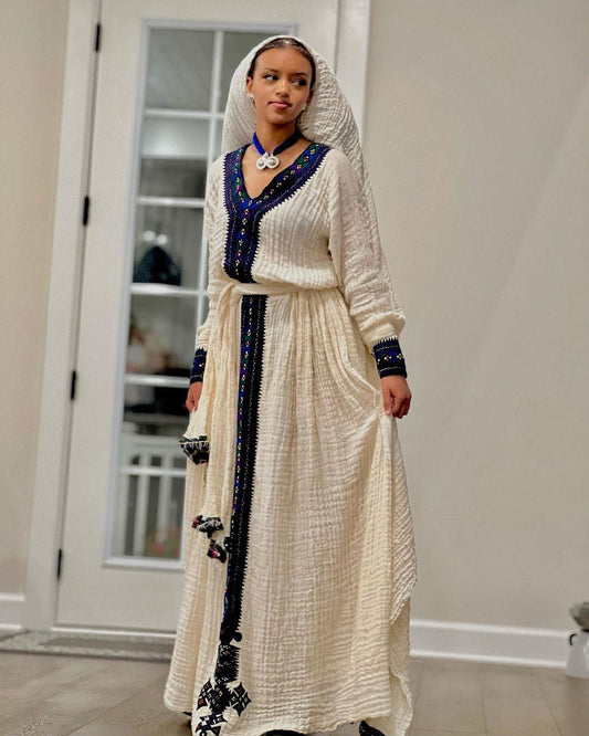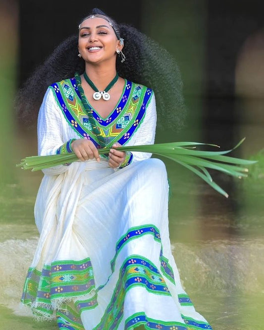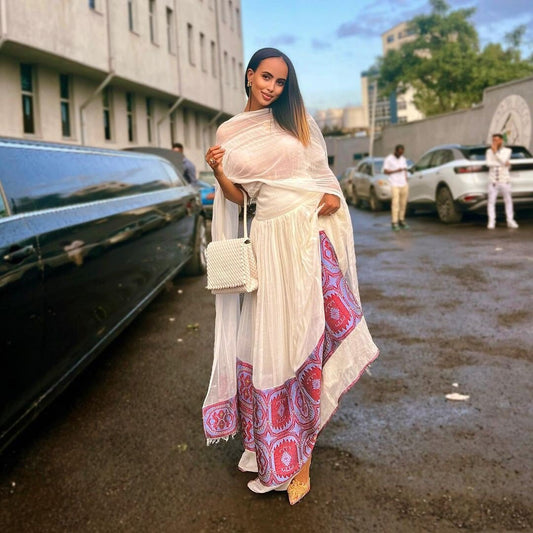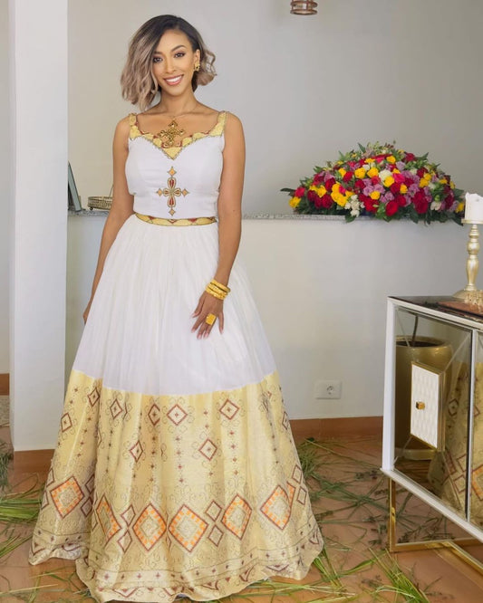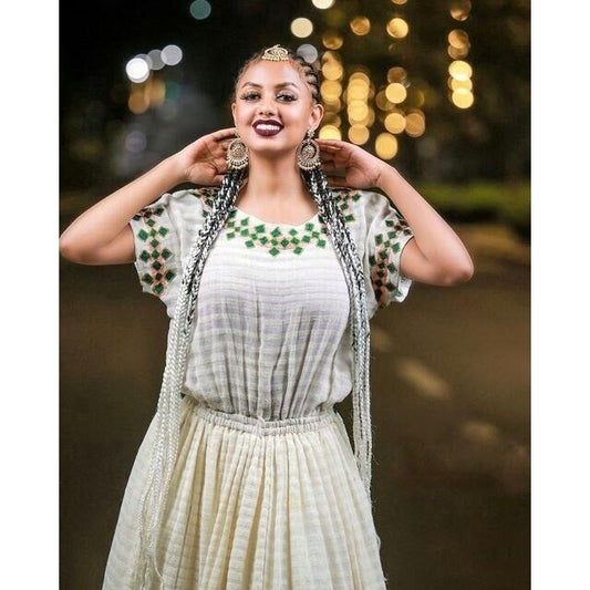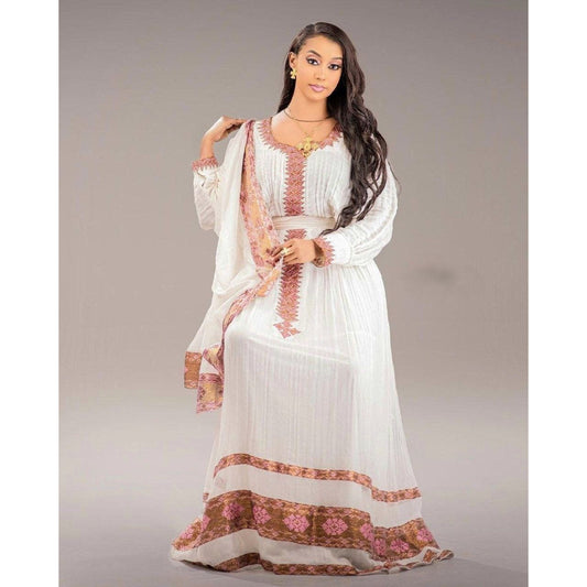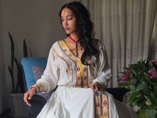 Simple Cross-Stitched Habesha Dress: with Multicolor Ornaments Traditional Ethiopian Dress