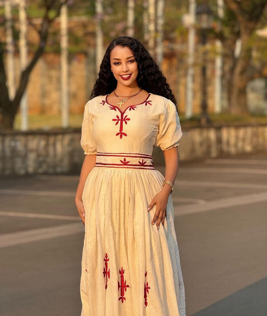 Simple Beige Habesha Dress Blue Cross Design Ethiopian Wear