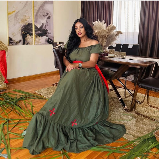 Simple Green Traditional Ethiopian Clothing: with Red Cross Detailing Habesha Dress Chic Habesha Kemis