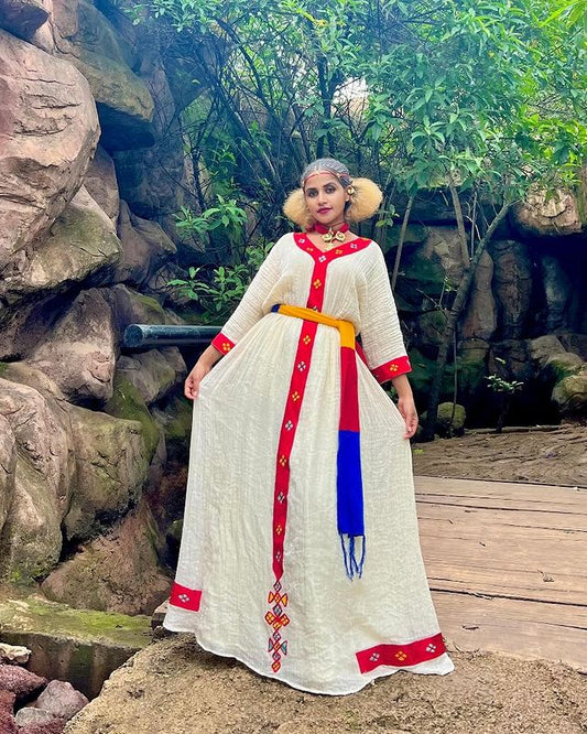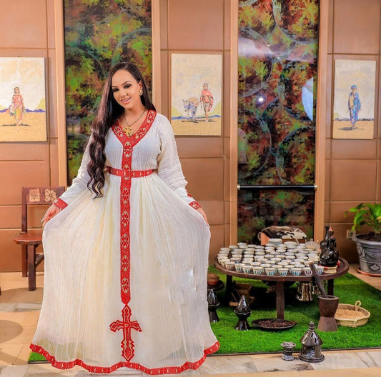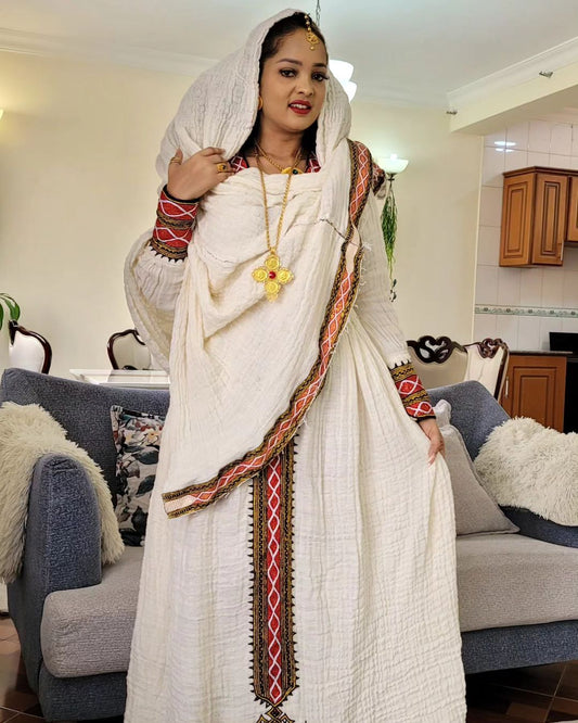 Simple Habesha Kemis with Bold Red Embroidery for an Event