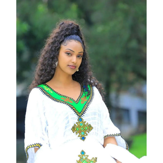 Simple Habesha Kemis with Green Accents – Traditional Ethiopian Dress – Habesha Clothing