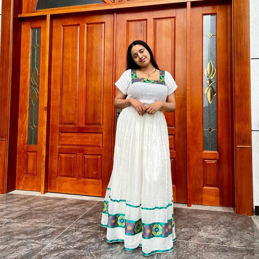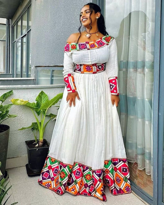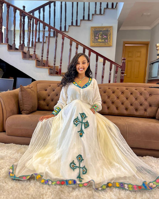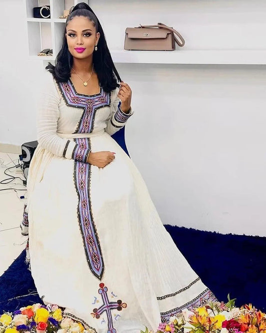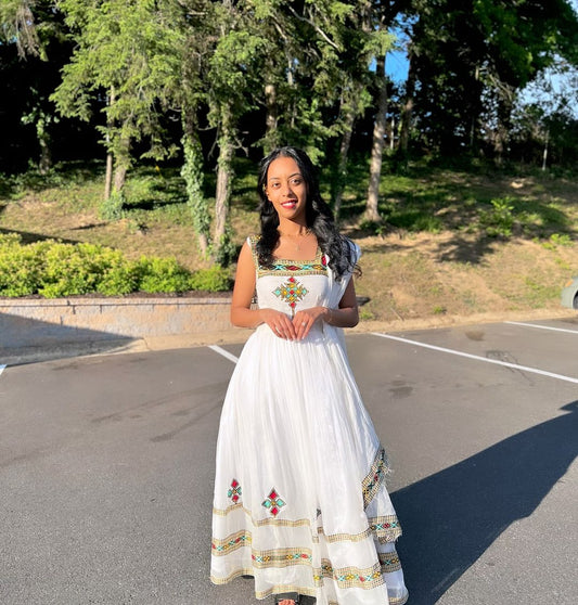 Simple Habesha Kemis with Gold and Colorful Embroidery – Eritrean Dress – Ethiopian Traditional Clothing
