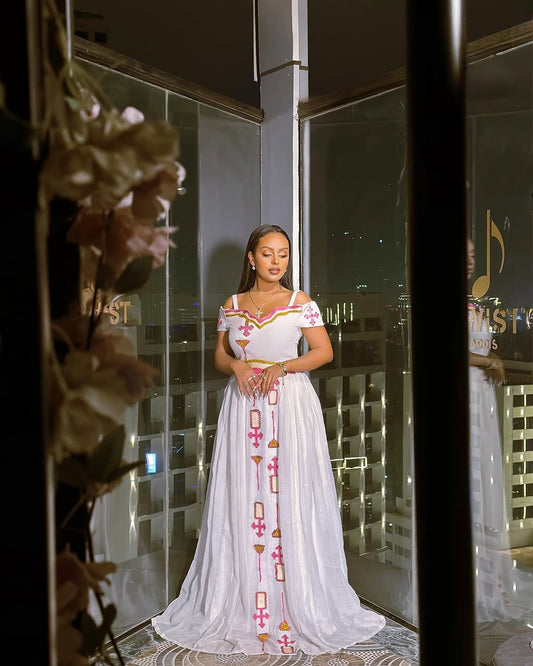 Simple Modern Habesha Kemis with Pink Accents – Ethiopian Traditional Clothing – Habesha Clothing – Ethiopian Dress