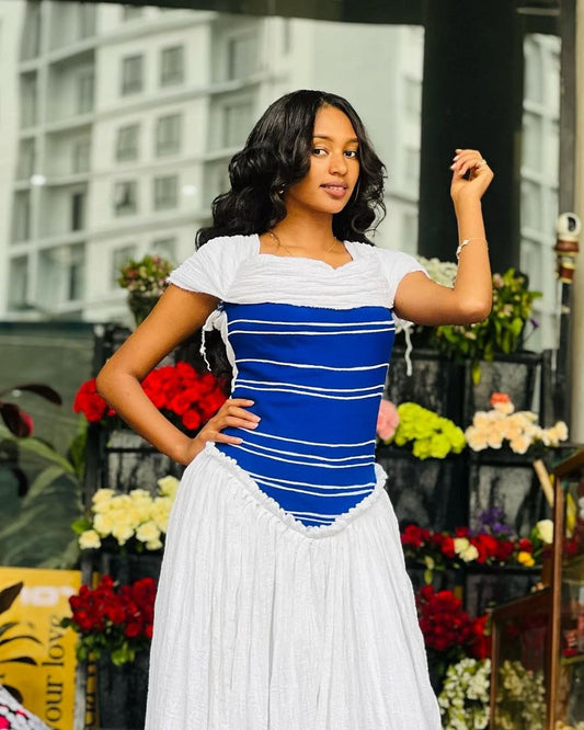 Simple Modern Habesha Dress with Bold Blue Bodice for Everyday Elegance and Cultural Gatherings