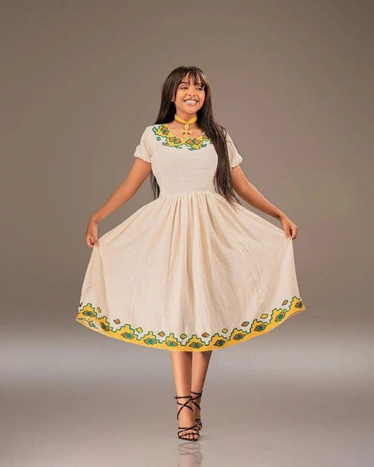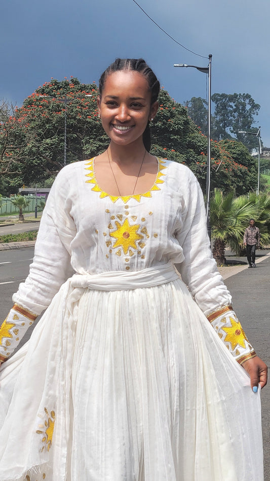 Simplicity in Yellow: Handwoven Shimena Habesha Dress with Tilf/ Embroidery, Habesha Kemis, Eritrean dress, ሀበሻ