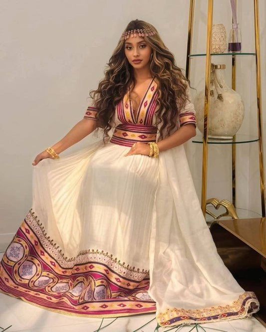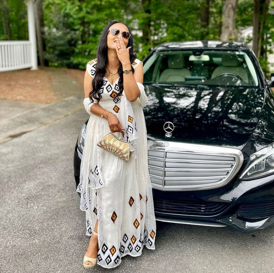 Stylish Habesha Dresses with Colorful Neck Embroidery and Ethiopian Motifs for Occasions