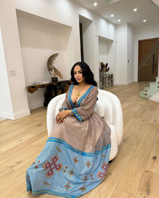 Stylish Modern Ethiopian Dress with Blue Wide Tilet Design Ethiopian Traditional Dress