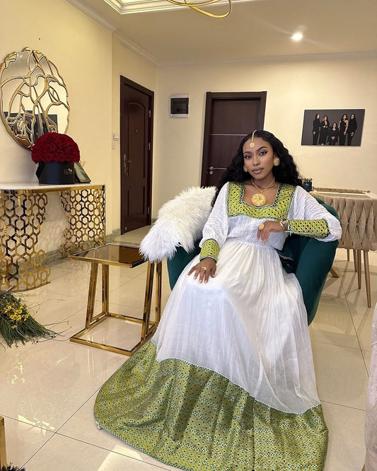 Stylish Habesha Kemis with Lime Green Accents – Eritrean Dress