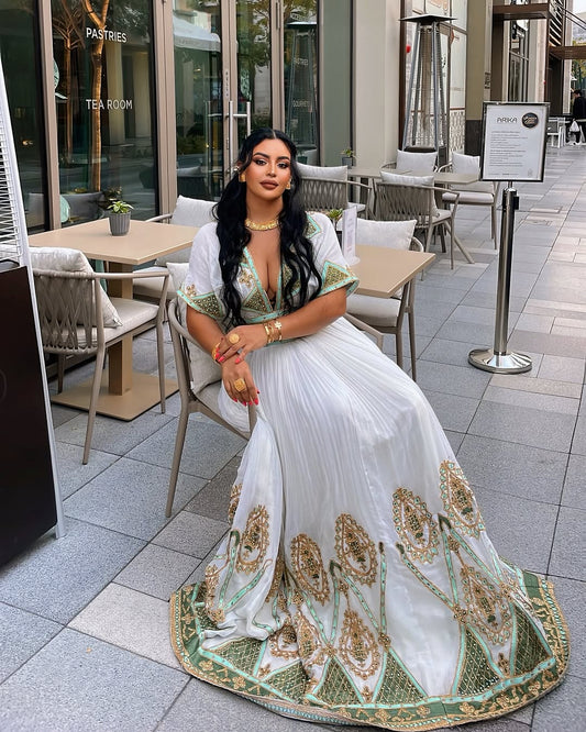 Stylish Habesha Kemis with Green and Gold Embroidery – Eritrean Dress – Eritrean Traditional Clothing