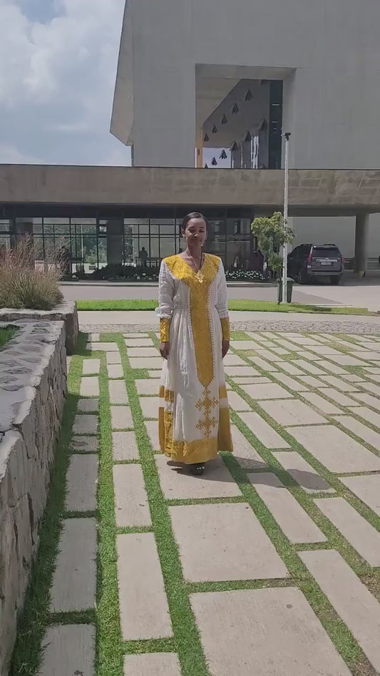 White And Yellow Traditional Ethiopian Dress Modern Embroidery Design Habesha Dress Handwoven Habesha Kemis 182