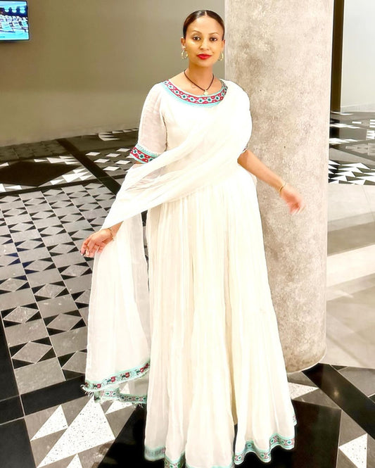 Tirtir Shimena 2-Piece Habesha Kemis with Tilf Neckline and Fetil, Habesha Kemis, Eritrean dress