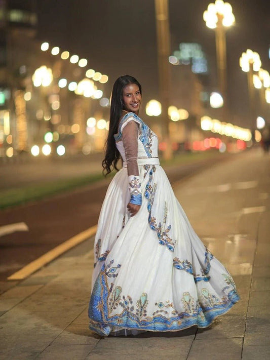 Beautiful Wedding Habesha Kemis with Blue and Gold Embroidery – Habesha Dress – Ethiopian Wedding Dress